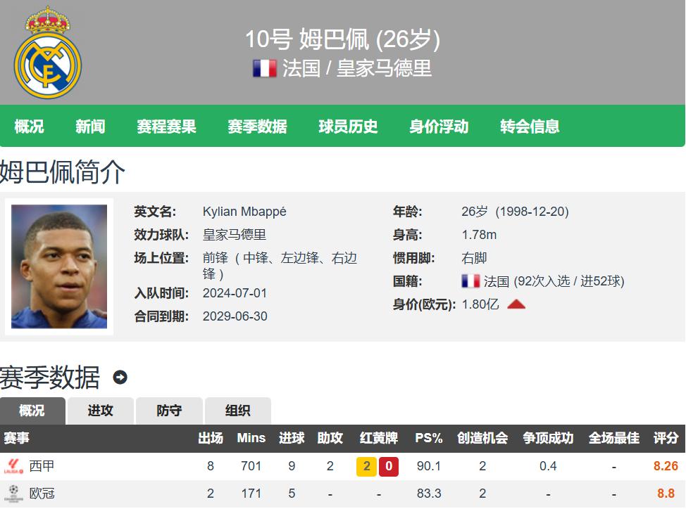 Mbappe năm nay 26 tuổi và được định giá chuyển nhượng là 180 triệu euro. Anh đã ra sân 8 lần ở La Liga mùa này và đóng góp 9 bàn thắng cùng 2 đường kiến tạo. Anh đã 2 lần ra sân ở Champions League và ghi được 5 bàn thắng. Tổng cộng, anh có 14 bàn thắng và 2 đường kiến tạo sau 10 trận trên mọi đấu trường. Hiệu quả này đã là phi thường rồi.