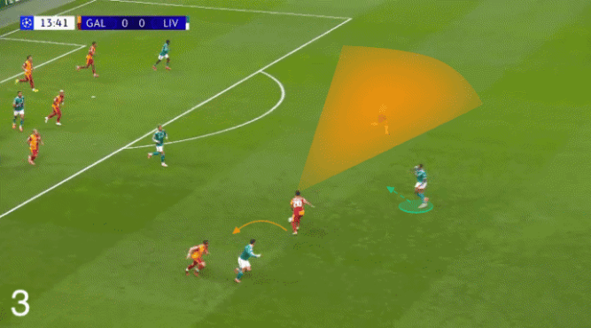 Khả năng quan sát và tầm nhìn vẫn là yếu tố then chốt trong trò chơi của anh ấy. Đây là một ví dụ từ chiến thắng 1-0 gần đây của Galatasaray trước Liverpool ở Champions League. Bị bao vây bởi ba người chơi đối lập, Gundogan xoay người nhiều lần cho đến khi nhìn thấy hướng đi đúng. Đúng lúc đó, Gundogan tung ra đòn phản công và cuối cùng Osimhen đã ghi được quả phạt đền quyết định.
